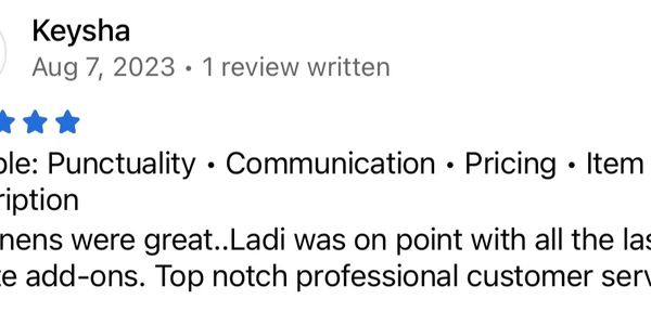 "Notable: Punctuality • Communication • Pricing The linens were great.. Ladi was on point with all the last minute add-ons. Top notch professional customer service."